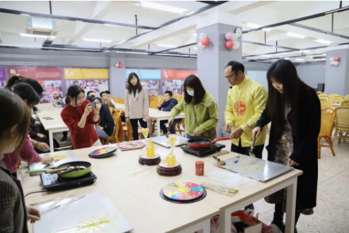百師園內(nèi),三千件國(guó)家級(jí)、省級(jí)非遺大師精品琳瑯滿目地陳列在我們眼前,讓人嘆為觀止,目不暇接。團(tuán)干青年們跟隨王壽權(quán)老師近距離學(xué)習(xí)和體驗(yàn)糖畫這一非遺文化技藝,近距離感受工匠精神和深厚的文化底蘊(yùn)。以糖漿為墨,以長(zhǎng)勺代筆,將心意揮灑在光潔的案板上,提、頓、放、收,或一筆帶過或一氣呵成,以獨(dú)特的風(fēng)格體驗(yàn),收獲“美”與“食”的藝術(shù)享受。
