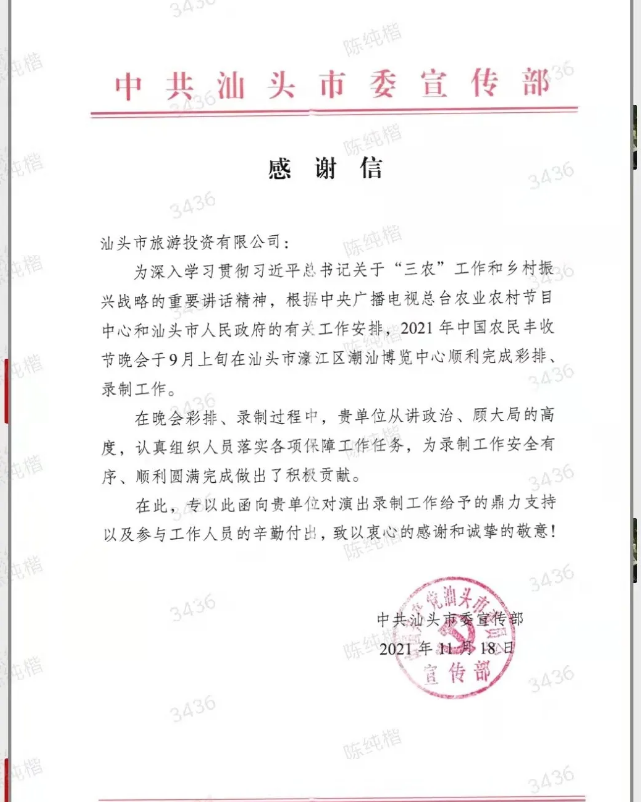 對于旅投公司的辛勤付出,汕頭市委宣傳部特意發(fā)來《感謝信》感謝旅游公司在晚會彩排錄制過程中,從講政治、顧大局的高度,認(rèn)真組織人員落實(shí)各項(xiàng)保障工作任務(wù),為錄制工作安全有序、順利圓滿完成做出積極貢獻(xiàn)。
