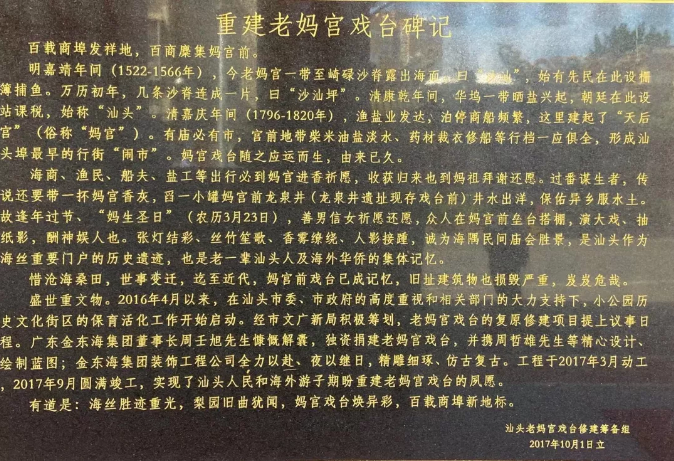 2016年,市委、市政府將老媽宮戲臺(tái)列入保育活化小公園片區(qū)的重點(diǎn)內(nèi)容,啟動(dòng)相關(guān)修繕工作,成為汕頭埠民俗文化展示館。2017年3月份修繕工程正式啟動(dòng),施工隊(duì)伍進(jìn)場(chǎng),夜以繼日,精雕細(xì)琢,短短不到半年時(shí)間,老媽宮戲臺(tái)復(fù)原修建項(xiàng)目完成從籌劃上報(bào)、到勘探設(shè)計(jì)再到復(fù)原修建并對(duì)外開放。在市委、市政府的大力支持下,專業(yè)設(shè)計(jì)團(tuán)隊(duì)的精心研究下,老媽宮一鍵重啟,美輪美奐、光彩耀人,重新出現(xiàn)在大眾的視線里。
