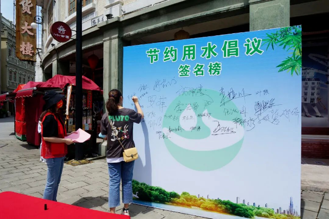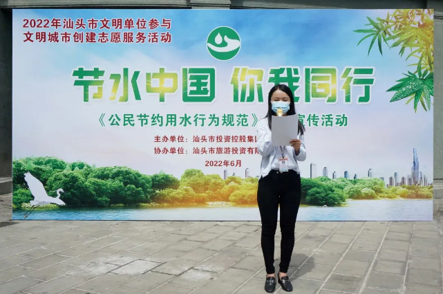 活動中,集團公司下屬企業(yè)汕頭市旅游投資有限公司副總經(jīng)理羅菲向全體市民游客發(fā)出節(jié)約用水倡議,并號召大家簽名支持。