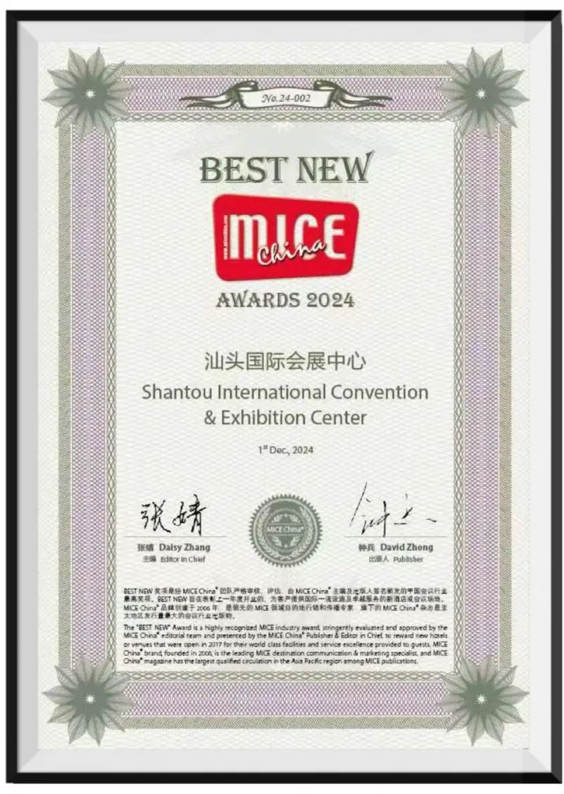 “BEST NEW”獎(jiǎng)項(xiàng)是MICE China Awards系列中最受矚目的獎(jiǎng)項(xiàng)之一,專為上一年度新開(kāi)業(yè)并提供國(guó)際一流設(shè)施及卓越服務(wù)的新酒店或會(huì)議場(chǎng)地設(shè)立。汕頭國(guó)際會(huì)展中心摘得“BEST NEW”桂冠,體現(xiàn)了業(yè)界對(duì)這一新場(chǎng)館的高度評(píng)價(jià)與肯定。