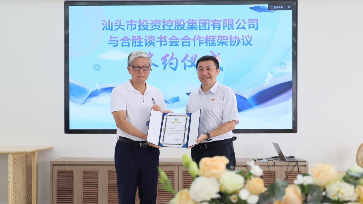 活動現(xiàn)場,在全體人員的共同見證下,吳少青、邱傳龍作為汕投控集團(tuán)和合勝讀書會代表簽署戰(zhàn)略合作協(xié)議,雙方將積極探索共建新思路,共同致力于在文旅項(xiàng)目開發(fā)、企業(yè)人才培養(yǎng)、打造學(xué)習(xí)型組織等方面開展更廣泛的深度合作。雙方還互贈了書籍。